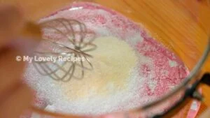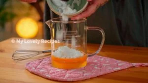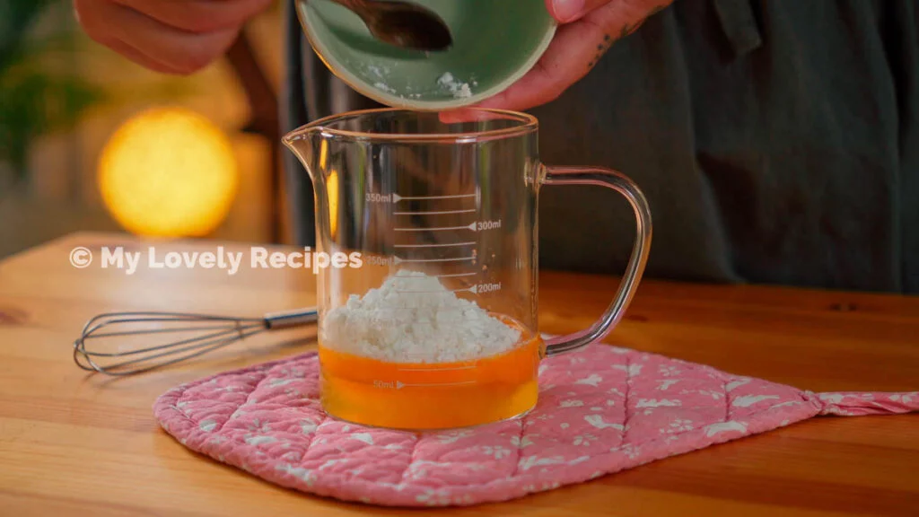 - 在蛋液中加入椰浆粉和盐搅拌均匀。稍微搅拌后放置一阵子再搅拌就比较容易变顺滑了。