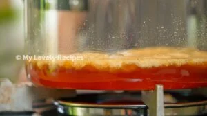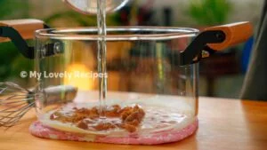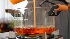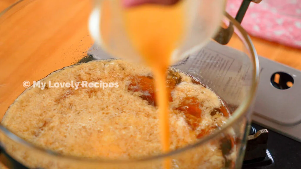 - 然后加入椰糖、清水和香兰叶。开火一直搅拌。