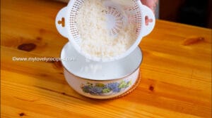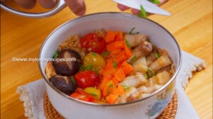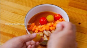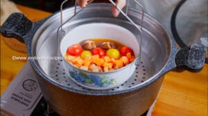 先把汤汁倒进装米的容器搅拌均匀,再放上五花肉、红萝卜丁、新鲜香菇和樱桃番茄。