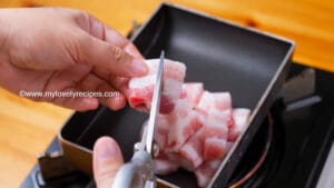 五花肉切成小块放入锅里,撒上少许盐,干锅煎到出油和微焦。