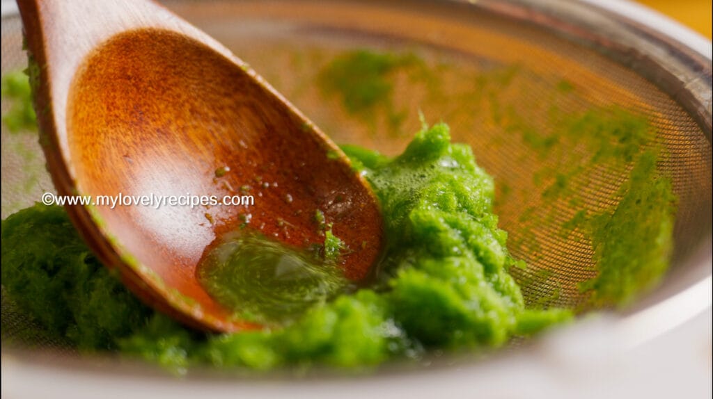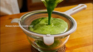 - 准备浓缩香兰汁。用嫩香兰叶加清水打汁,过滤放入冰箱隔夜沉淀。隔天可以用汤匙撇去上层透明的水或用针筒吸取其最浓郁的部分,看哪一种方式适合你。