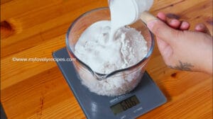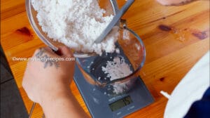- 加入砂糖、木薯粉、椰浆和一点点盐,记得观察总重量是多少。然后混合均匀。