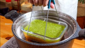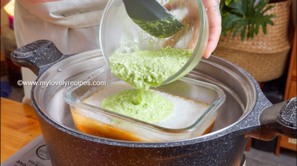 - 将您喜爱的分层顺序(例如:先焦糖褐色、再椰浆白色、最后香兰绿色)一层层倒入模具里蒸熟。
